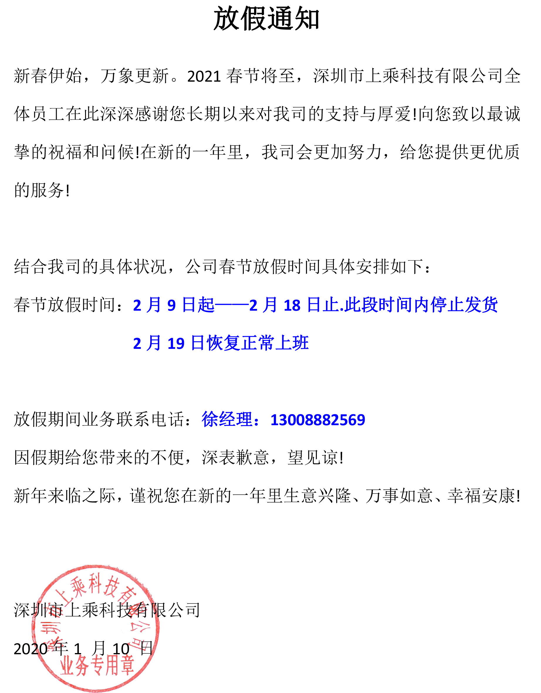深圳市J9·九游会「中国」官方网站 2021年放假通知